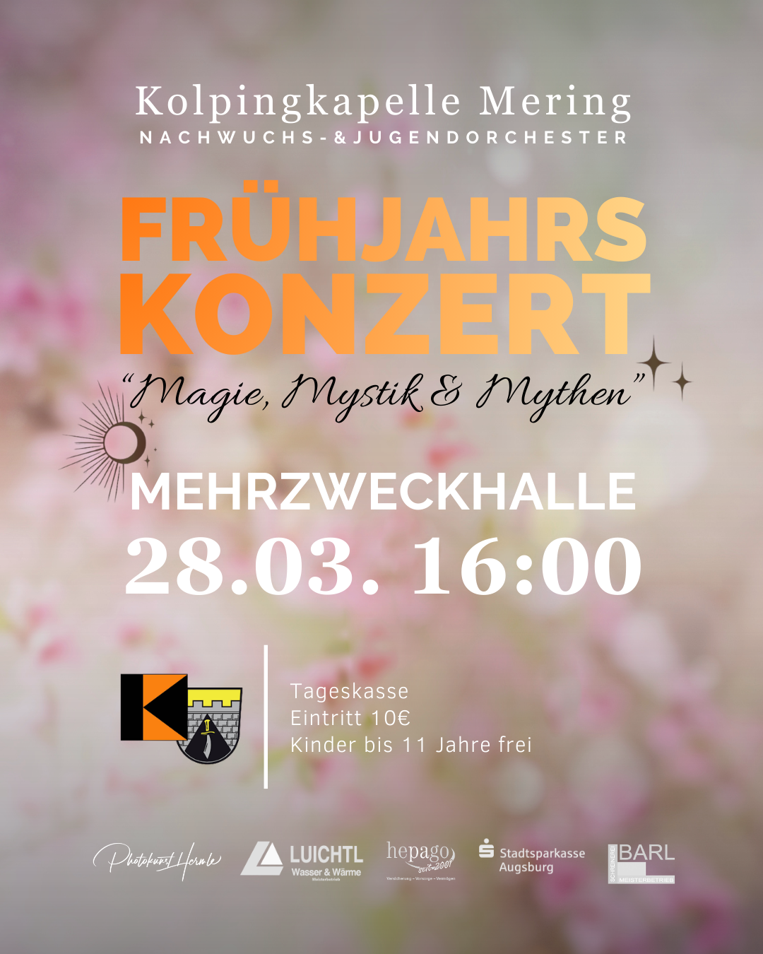 In diesem Jahr findet das Frühjahrskonzert mit dem Jugend- und Nachwuchsorchester sowie den MusicKids unter dem Motto "Magie, Mystik & Mythen" in der Meringer Mehrzweckhalle statt. Beginn ist am Samstag, 28. März 2026 um 16 Uhr.